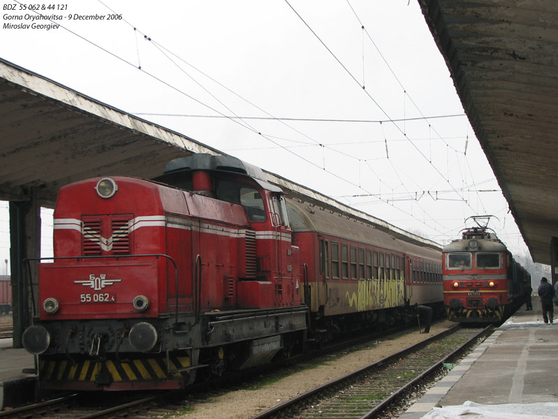 Locomotive 55 062 does some shunting at the station of Gorna Oryahovitsa. On the adjacent track is locomotive 44 121 with a stopping service Ruse - Stara Zagora. 9 December 2006
