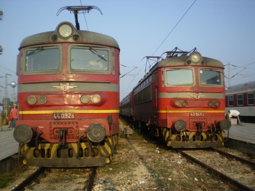 on the next railway track is a romanian GFR disel locomotive class 60.1523 and BDZ electric locomotive class 43.544