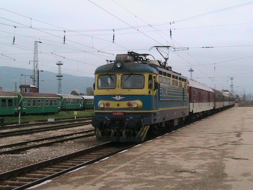 BDZ Electric locomotive 44.001-6 ( home depot Sofia) arrives at railway station Septemvri with fast train Sofia -Poduiane - Iskar - Ihtiman - Kostenec - Belovo - Septemvri - Pazardjik - Plovdiv - Trakia - Belozem - Chirpan - Mihailovo - Stara Zagora - Nova Zagora - Iambol - Zimnica - Straldja - Karnobat - Aitos - Vladimir Pavlov - Burgas BV 8615
