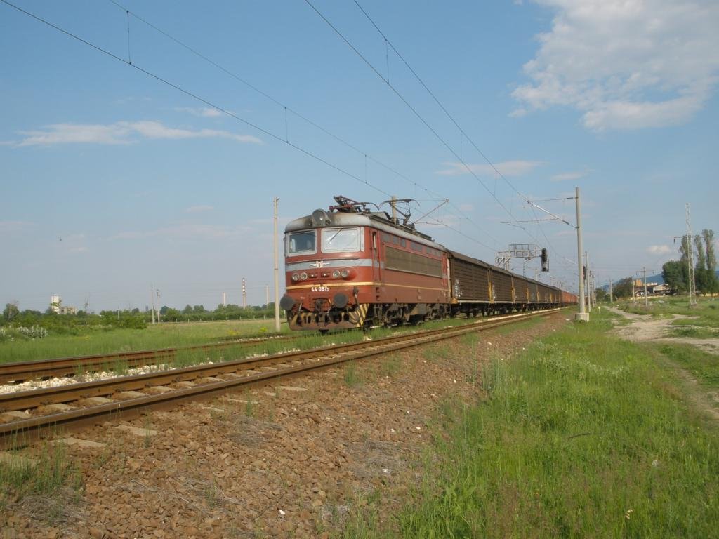 44087-5 leaving railway station Pazardjik with freight train from Svilengrad to Sofia.