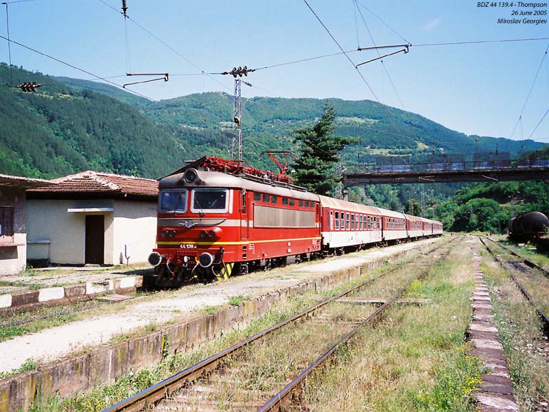 Locomotive 44 139.4 passes through the small station of Thompson with a fast train from Sofia to Ruse. 26 June 2005