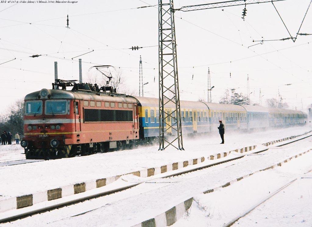 Locomotive 45 167.4 (home-depot Plovdiv - apologies for my mistake in the photo below) passes the railway station Iskar in Sofia with the Diana train (Yambol - Sofia) on 8 March 2005. The solitary figure on the platform is the station official in charge of train traffic.