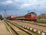 Locomotive 45.169 at railway station Boychinovtsi with fast train from Vidin to Sofia (7622) and EMU 32.107+32.108 with local train from Boychinovtsi to Berkovitsa.
