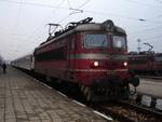 BDZ Electric locomotive 45.187.2 (home depot Plovdiv) with the "White horse" express train from Plovdiv to Vraca at railway station Septemvri