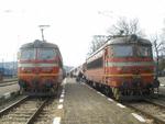 One to another on railway station Brusartsi are standing 45193-0 , using a local train to Lom and 45195-5 with fast train from Sofia to Vidin.