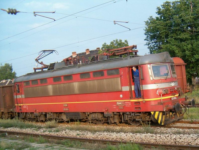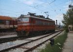 Locomotive 45 193.0 with a freight train in the station of Mezdra. Among the cars were also a few military transport platforms loaded with trucks. Next to the electric locomotive is the diesel machine 55 150.7 awaiting shunting duties. 10 October 2004