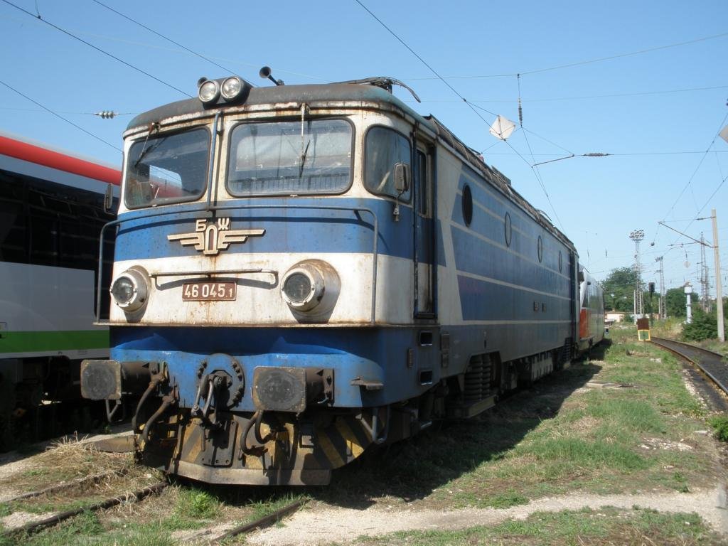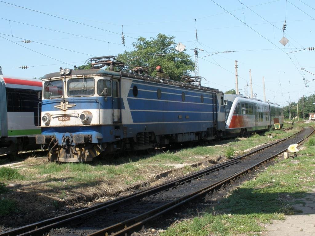 46045-1 (home depot Bugras) on central railway station Plovdiv with freight train from Ognianovo to Radnevo.From railway station Nova Zagora to Radnevo , the train is using by diesel locomotive.