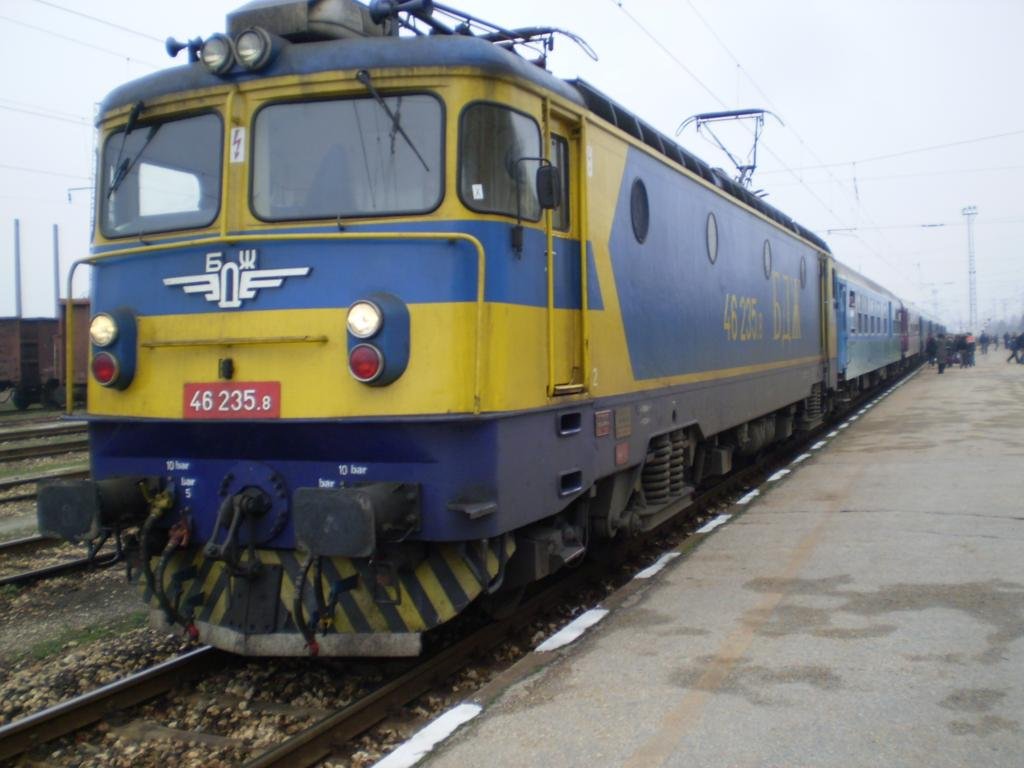 BDZ Electric locomotive 46.235.8 (home depot Burgas) at railway station Septemvri with Express Sunny beach - Sofia - Plovdiv - Burgas.