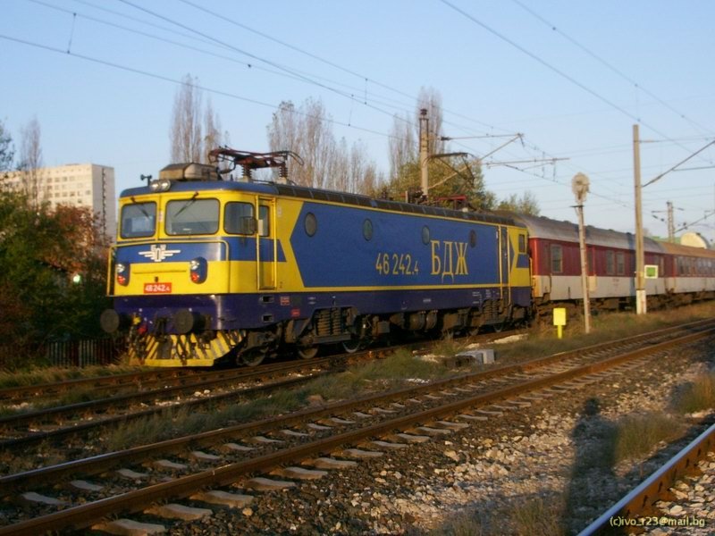 BDZ 46 242 is arriving at station Iskar with fast train 3621. Photo taken on 03.11.2005.