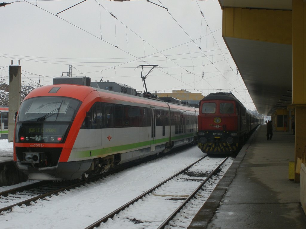 One to another on central railway station Plovdiv are standing EMU DESIRO 30029-7+30030-5 , using a Regional train from Karlovo and 07123-3 with fast train with number IR 1671 Inter Regio to Dimitrovgrad.This IR train moves only in Sunday.