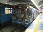Metro Sofia train of type 81-717 in station Joliot-Curie, July 2010.