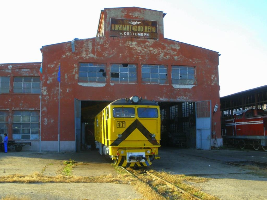 A diesel locomotive with number 401 (ex number BDZ 76012-4) standing in depot Septemvri.The mashine is ready from general overhaul , because before several months , the Argentinian company "YCRT Rail" - Santa Cruz sold 3 mashines of this class for work in mines , situated in Patagonia - a geographic region in Argentina , containing the southernmost portion of South America.