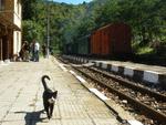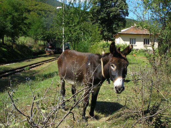 The attraction run of BDZ narrow gauge steam locomotive with number 609.76 on 22th September 2009 year with the participation of foreign tourists - germans and frencmen.On this photo , the steam locomotive with an attraction train standing on railway station Dolene and wait to fill with water.An extra light - speed donkey , who inhabit the area , near the railway station , meet with Welcome arriving and departuring trains with the loudly bellow.It`s a good idea to be a tied up with rope to spike , because if the donkey is come undone , it will be disappear as quick as a light in the nearest dense and thick forest.