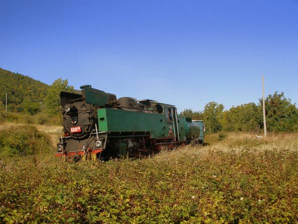 The attraction run of BDZ narrow gauge steam locomotive with number 609.76 on 22th September 2009 year with the participation of foreign tourists - germans and frencmen.On this photo , the steam locomotive with an attraction train departuring from railway station Varvara.