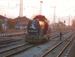 A private diesel shunter with number 98 52 00 55 238 - 0 , owned by private operator "Bulmarket" at railway station Iliyantsi with freight train.