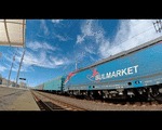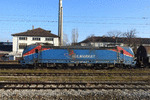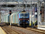 A private electric locomotive SIEMENS Smartron with number 91 52 10 80 024 - 8 , owned by private operator "Bulmarket" near central railway station Ruse with freight train. A video about crossing the train, you can see here: