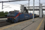 A private electric locomotive SIEMENS Smartron with number 91 52 10 80 025 - 5 , owned by private operator "Bulmarket" cross through railway station Pazardjik with freight train.