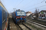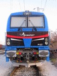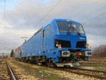 A private electric locomotive SIEMENS Smartron with number 91 52 10 80 027 - 1 , owned by private operator "Bulmarket" standing at railway station Kostenec, before pulling a freight train.