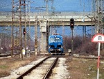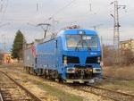 A private electric locomotive SIEMENS Smartron with number 91 52 10 80 027 - 1 , owned by private operator "Bulmarket" standing at railway station Septemvri with freight train.