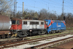 A private electric locomotive with number 91 52 00 85 005 - 4 , owned by private operator "Bulmarket" at railway station Senovo with freight train.