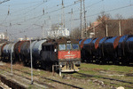 A private electric locomotive with number 85005 , owned by private operator "Bulmarket" at central railway station Stara Zagora with freight train.