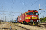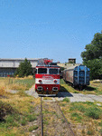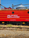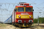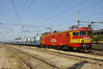 A private eletric locomotive with number 91 52 00 46 757 - 8, owned by "Express Service", standing at railway station Dimitrovgrad central with freight train.