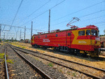 A private eletric locomotive with number 91 52 00 46 728 - 9, owned by private operator "Express Service", standing near railway station Dimitrovgrad central after pulling a freight train.
