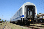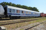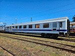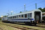 A private passenger car, type Avmz with number 61 80 19 91 347 - 3, owned by private operator "PIMK Rail Express", part of "PIMK Rail", standing at railway station Septemvri in composition of test train.