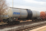 A private freight tank car "Zas" , owned by private operator "PIMK Rail" at railway station Pazardjik in composition of freight train.