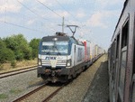 A private electric locomotive SIEMENS Vectron with number 80 962 , owned by private operator PIMK near railway station Parvomay with freight train.