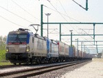 A 2 electric locomotives SIEMENS Smartron and Vectron all owned by private operator "PIMK Rail" at railway station Pazardjik with freight train.