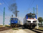 A view from 2 private locomotives , all owned by private operator "PIMK Rail" , standing at railway station Todor Kableshkov with freight trains.