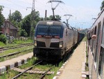 A private electric locomotive SIEMENS Vectron with number 91 52 10 81 972 - 7 , owned by private operator "PIMK Rail" at railway station Vakarel after pulling a freight train.
