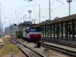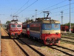 A private electric locomotive with number 91 52 00 43 556 - 7 , owned by private operator TPPBD ("Termo Power Plant Bobov Dol") at central railway station Plovdiv with freight train.