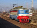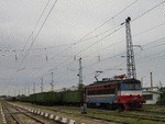 A private electric locomotive with number 91 52 00 43 556 - 7 , owned by private operator TPPBD ("Termo Power Plant Bobov Dol") at railway station Pazardjik with freight train.