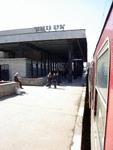 BDZ This is red - white passenger cars with fast train from Sofia to Varna leaves railway station Cherven brqg.