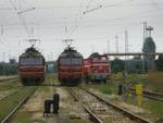 A view from railway station Septemvri.One to another are standing EMU DESIRO , using a Regional train from Sofia to Plovdiv and electric locomotive of class 46-00 with IR train from Sofia to Burgas.