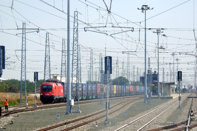 A view from railway station Zimnitsa.A special military NATO freight train is prepare to departure.