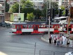 Tatra Trailer B4D-C 192 (ex Halle) on blvd. Konstantin Velichkov, April 2012. The trams stop here always in the middle of the road, so leaving and entering is quite dangerous for the passengers. Photo by M. Koblischka (koblischka@t-online.de) |