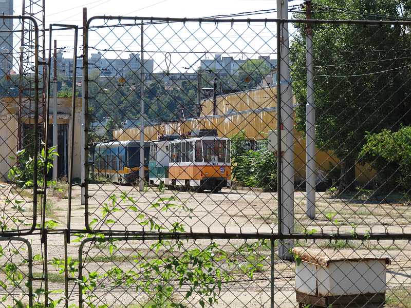 Sofia depot Krasna Polyana. August 2022. Sofia T6A2SF 2041, the work car 85 and a PESA Swing in the depot. Photo by M.Koblischka |