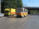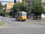 Sofia Tatra 2044 at the crossing bul. Konstantin Velichkov/bul. A. Stamboliski. August 2017. The single tram serves line 10. Photo by M.Koblischka |
