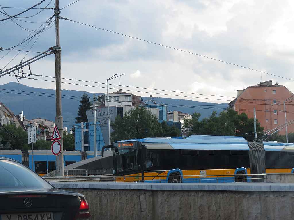 Sofia trolleybus 2801 (line 9) at the crossing blvd. Bulgaria/blvd. Akad. I. Geshov. July 2022. Behind a PESA Swing at stop "bul. Akad. Ivan Geshov". Photo by M.Koblischka |