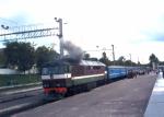 Belorussian deisel TEP70-0225 releases the cloud of smoke and starts the 1000 km journey to Moscow. Grodno-Moscow "Nieman" train passes such famous towns as Minsk and Smolensk. The whole route takes 17 hours. Photo taken on Grodno station 10.08.2001 at 16.47.
