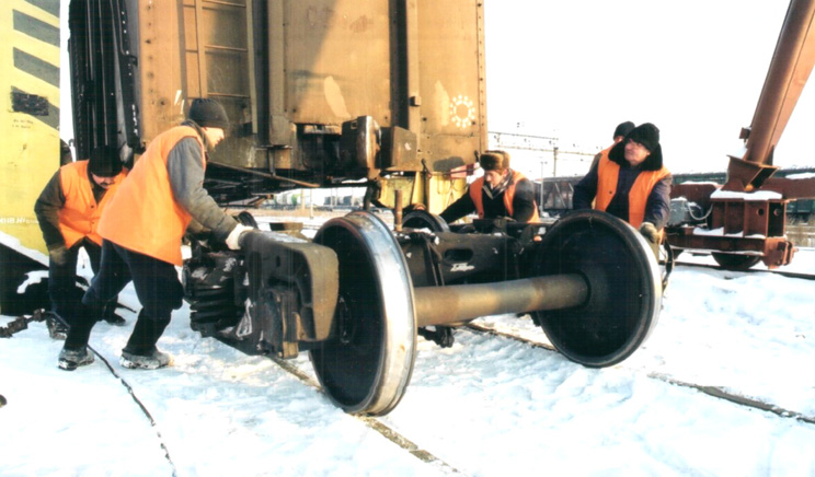 The boogies of international trains between the former USSR (broad gauge, 1520mm) and Central/Western Europe are changed at the border with Poland, Slovakia, Hungary or Romania, e.g. at Brest (Belorussia, near the Polish-Belorussian border); 2002-07-21
