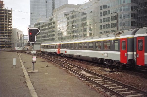 Open-room 1st-class (Mk2) EC car (Apm) of SBB/CFF/FFS, seen in the consist of EC 97 "Iris" (Bruxelles Midi/Brussel Zuid--->Zürich Hbf), while entering Bruxelles-Nord/Brussel-Noord, its very first stop.