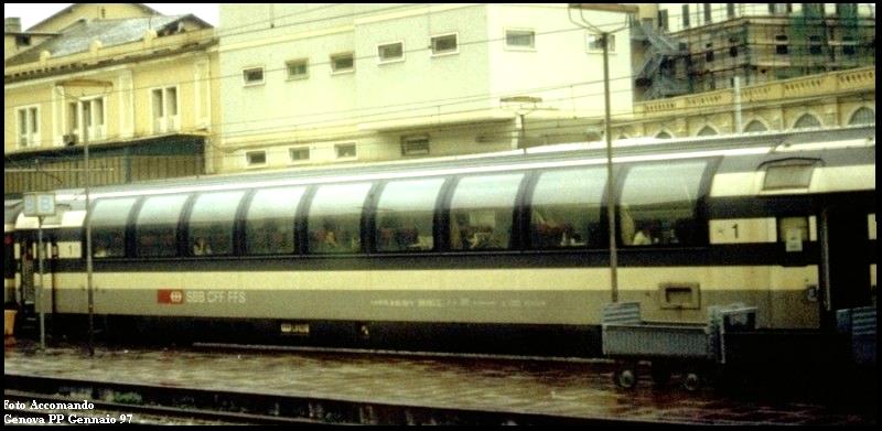 SBB 1st Class Panorama. An unidentified SBB First class panorama coach on Monday afternoon September 17th, 2001 at Venezia S Lucia station. It is marshaled next to a FS Restaurant car and these two were the rear coaches of Train # IC355 (09:07 from Zurich). A major storm was brewing in the background.