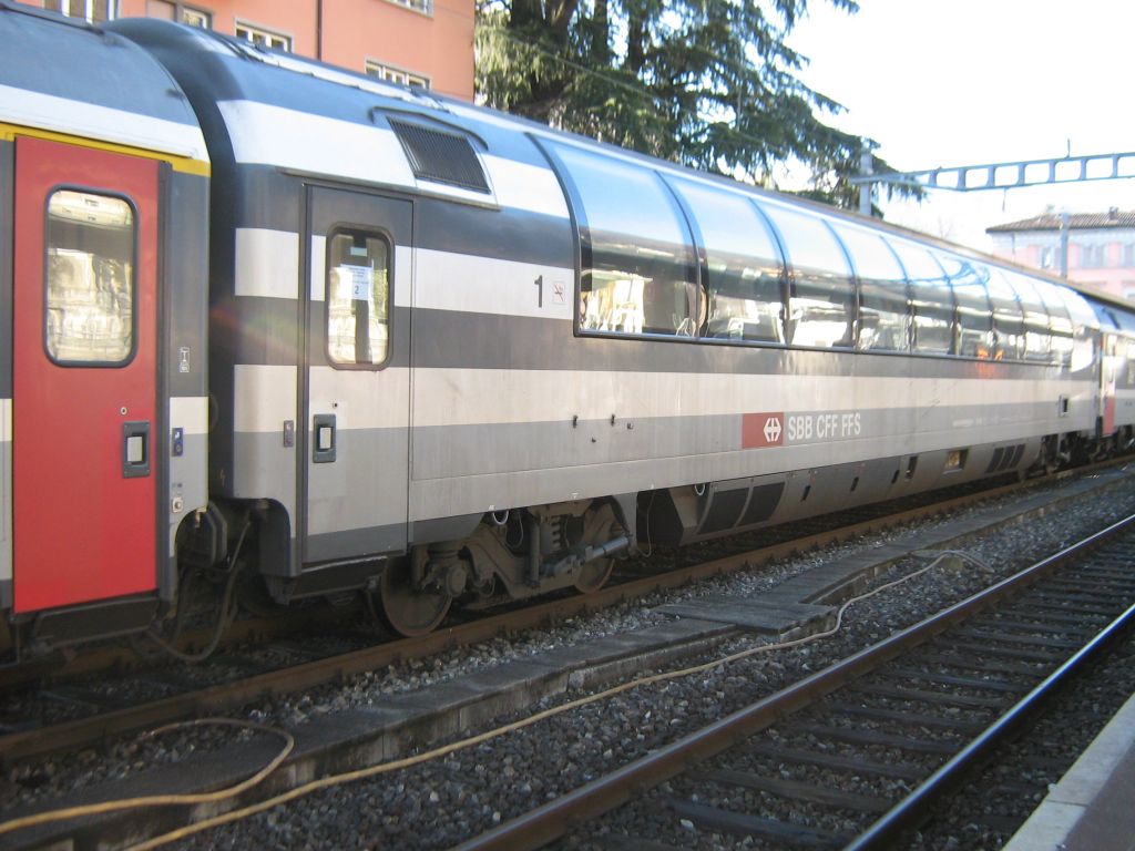 "Panorama" open-room 1st-class EC car (Apm) of SBB/CFF/FFS, seen in the consist of IR 2267 (Zürich HB ---> Locarno).