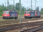 SBB Cargo - 421390-6 Lok 421371-6 (links) und 421390-6 (rechts im Bild) mit einem Güterzug am 10. Juli 2008 im Bahnhof Ludwigshafen Mitte an der Rheinbrücke.