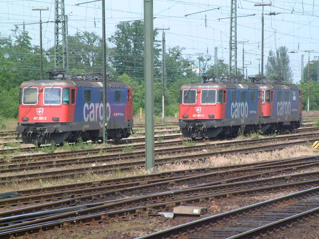 | Swiss SBB locos in Germany: 421 391-4 plus 421 392-2 and a further unknown 421 are waiting at Worms station for next duties. Seen on 05.06.2007 Digital-photo by Otto Welsch (welsch-family@t-online.de) |