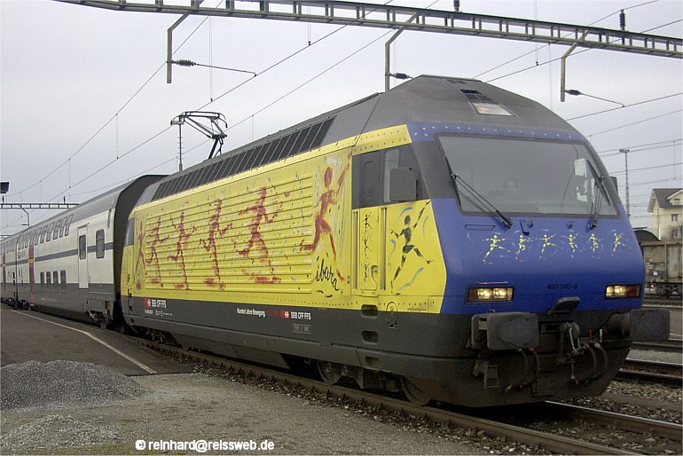 SBB 460 040, designed by an artist named "Ibara" with an Interregio train in Rotkreuz (25.Nov.2002)